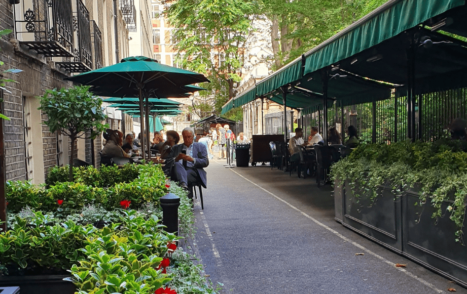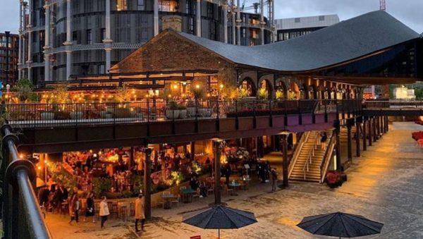 Coal Drops Yard by Kings Cross/ St Pancras filled with water fountain walkways and al fresco dining in various styles, I love the Plaza Pastor (for tacos and margaritas) and also The Granary. Or head to the brand new outdoor terrace at The Standard Hotel (by St Pancras) for posh cocktails.