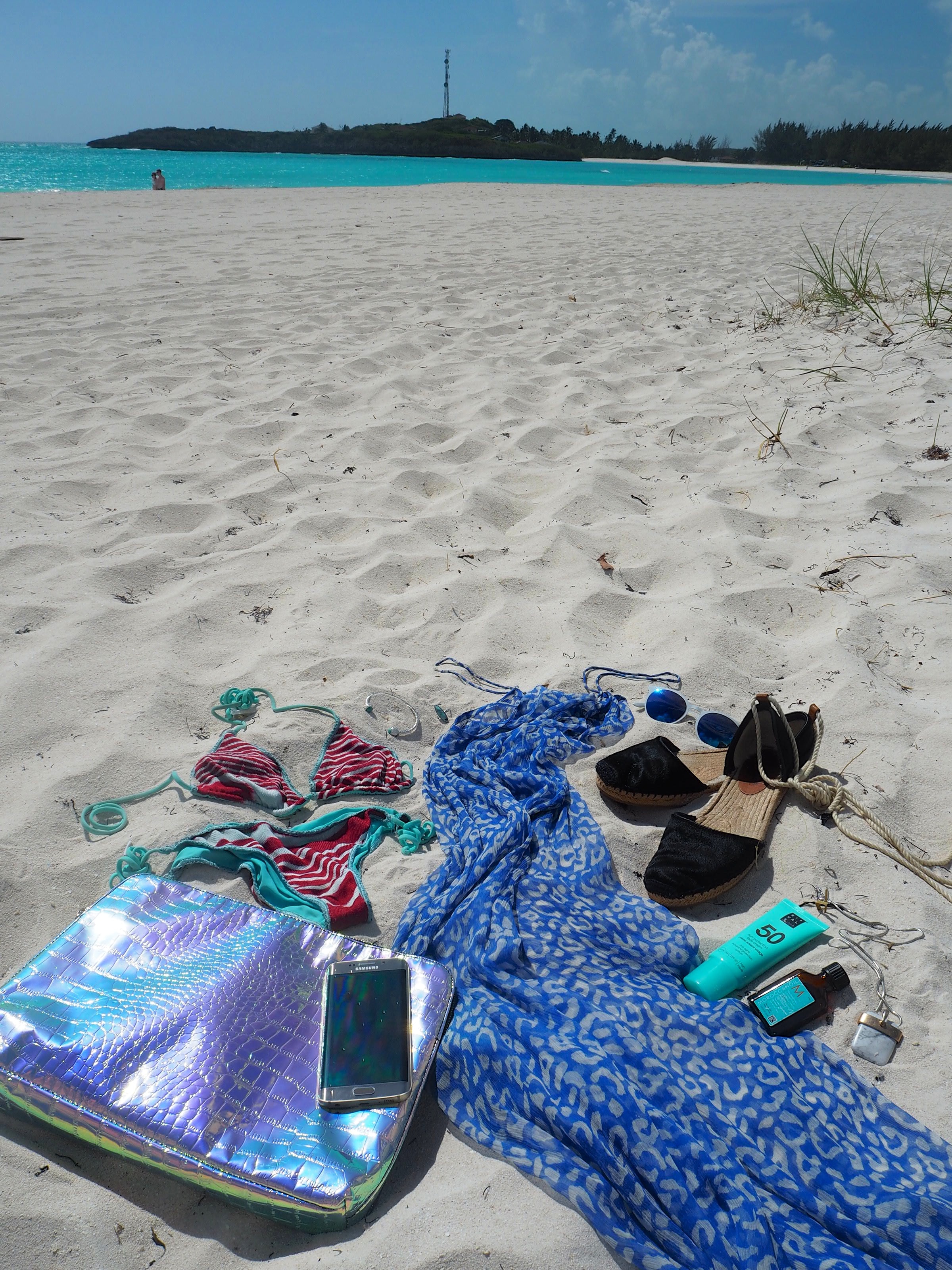 Above clockwise from left to right: Samsung Galaxy S6 Edge, Metallic clutch bag – Asos, Bikini – Missoni, Bracelet – Wallis Jewellery, Turquoise ring – Asos, Blue beach dress – Cloe Cassandro, sunglasses – Asos, Espadrilles – Uggs, Factor 50 face cream – Rituals, Moroccan hair oil, Marble necklace – Mint Velvet.