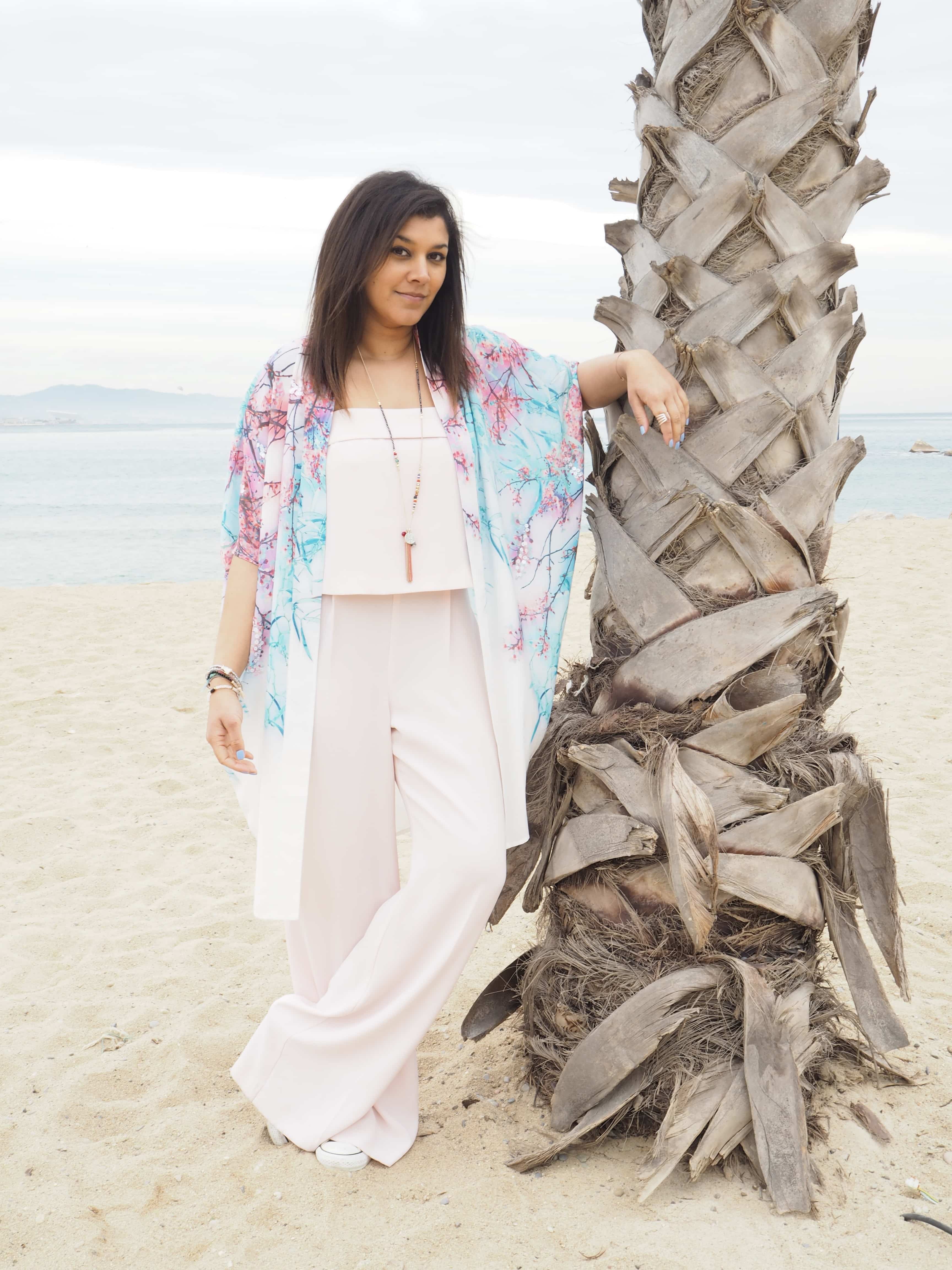 Opening shot at top of page: Floral kimono, pink jumpsuit and necklace all by Wallis
