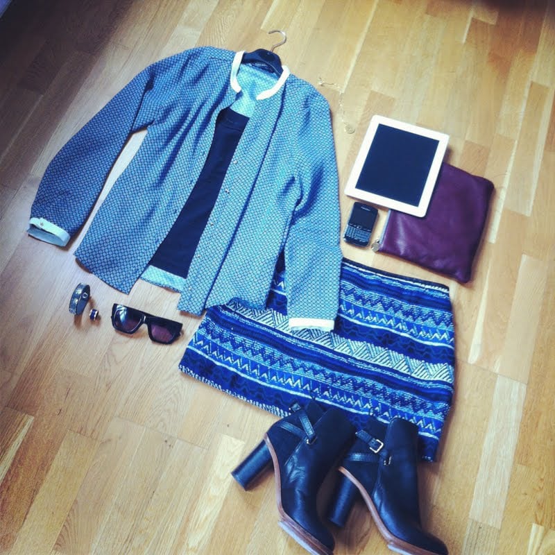 Clockwise from left to right: Silk shirt – Zara, Black vest – T by Alexander Wang, I-pad – Apple, I-pad case – Clare Vivier, Phone – BlackBerry, Wool skirt – Zara, Boots – Acne, Sunglasses – Kurt Geiger, Marble ring – Bulgari, Bracelet – Swarovski