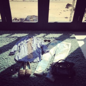 Clockwise from left to right: Breton sweater – APC at net-a-porter, Stripe shirt (over the sweater) – Topshop, Sunglasses – Rayban, Tie-dye jeans – Asos, Bag – Mulberry, Python loafers – Sambag, Watch – GC watches, Friendship bracelet – Daisy Jewellery.