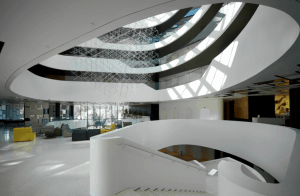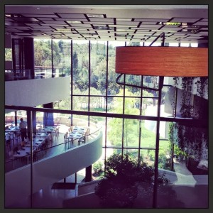 Modern architecture in the light and sculpture filled atrium of the Lone Hotel