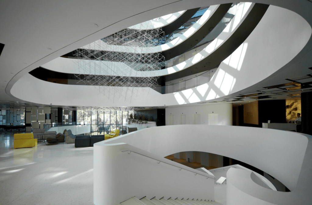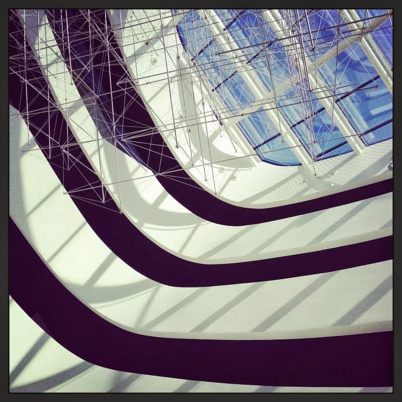 Modern architecture in the light and sculpture filled atrium of the Lone Hotel