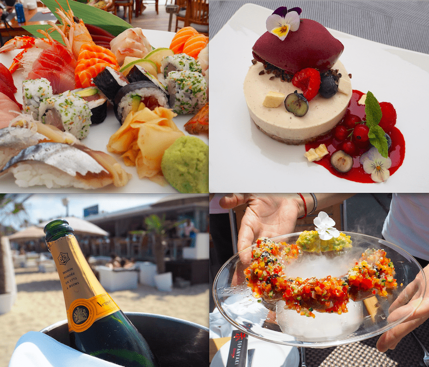 Clockwise from top left: Splendid sushi and decadent desserts at Blue Marlin Ibiza, experimental steam cuisine, ceviche at Beachouse and a chilled bottle of Veuve Clicquot at Nassau Beach Club.