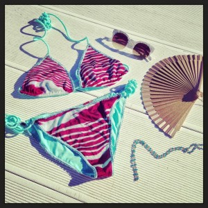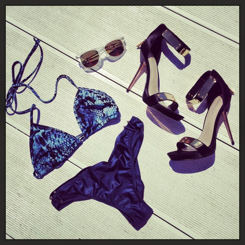 Above clockwise from left: Snake print bikini top – Lara Ventura, Mirrored sunglasses – Rayban, Black metal heels – Carvela Kurt Geiger, Green bikini bottoms – Reiss.