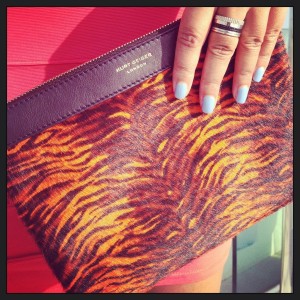 Above clockwise from left: Tiger pony skin clutch bag – Kurt Geiger, Ring – Boucheron, Nail colour – Ultraviolet Marks & Spencer Limited Collection.