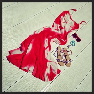 Above clockwise from left: Red dress – Dries Van Noten, Red sunglasses – KG Kurt Geiger, Turquoise bracelets – H&M, Blue ethnic ring – Dorothy Perkins, Metallic flat sandals – Carvela Kurt Geiger.