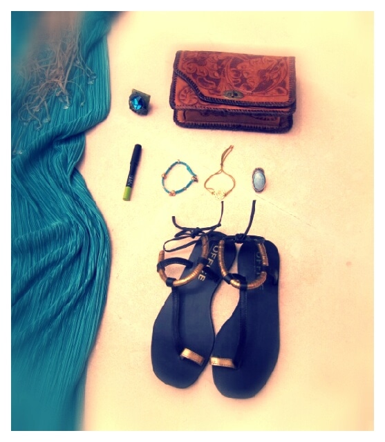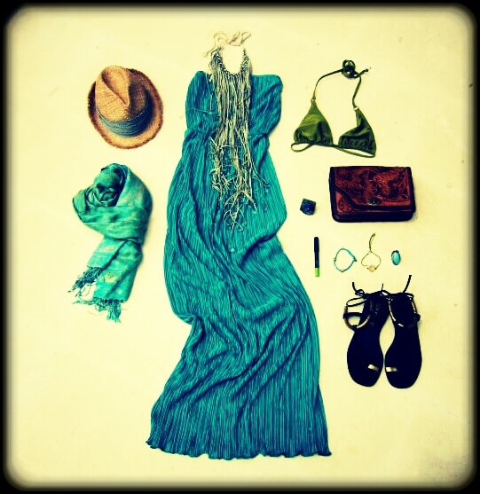 Straw trilby – Zadig et Voltaire http://www.zadig-et-voltaire.com, Tuquoise scarf – Satya http://www.satyajewelry.com, Green dress – Miss Selfridge http://www.missselfridge.com, Leather strand necklace – All Saints http://www.allsaints.com, Bikini top – Ted Baker http://www.tedbaker.com, Tooled leather bag – Ibiza Hippy Market, Crystal ring (seen below) – Lucy Hutchings http://www.lucyhutchings.com/, Lime Eye Pencil – Mac, Turquoise skulls friendship bracelet – Elkin http://www.elizabethgaltonstudio.com, Yellow chakra bracelet – Daisy http://www.daisyjewellery.com, Turquoise ring – Dorothy Perkins http://www.dorothyperkins.com, Sandals – Office http://www.office.co.uk