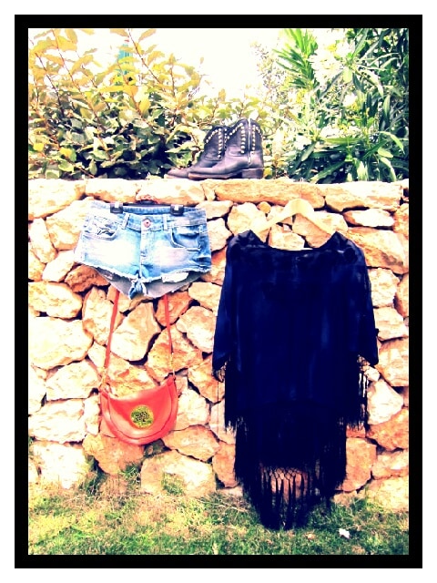 Navy embroidered top – River Island http://www.riverisland.com, Coral over body bag – Mulberry http://www.mulberry.com, Denim shorts – Zadig et Voltaire http://www.zadig-et-voltaire.com, Boots – Ash http://www.ashfootwear.co.uk/