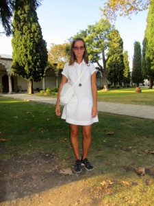 | Valentina from Italian Vogue wears a simple white shift dress |