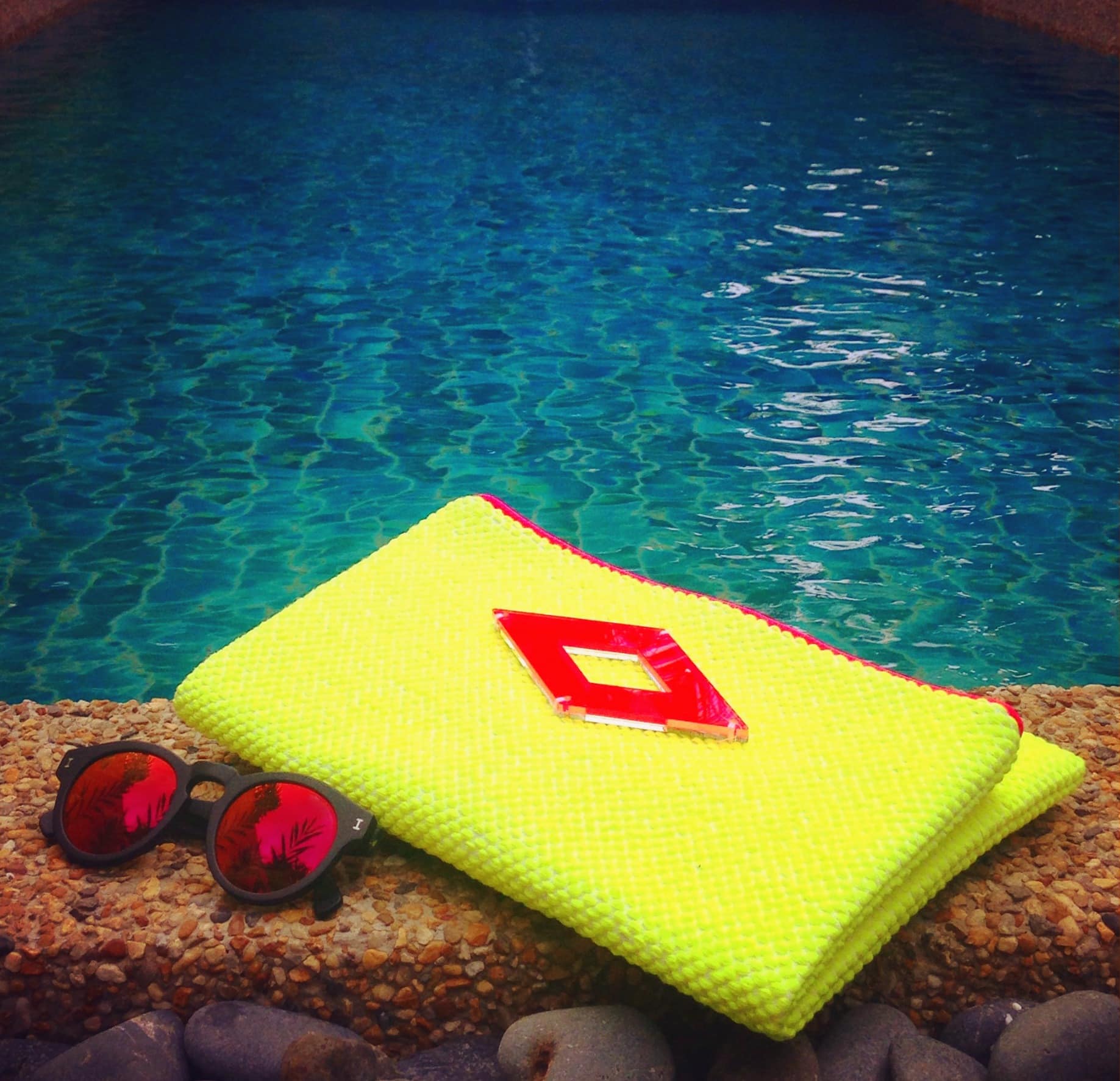 Below: Neon yellow clutch bag – Koku, Sunglasses – Illesteva all from Salt Resort Wear