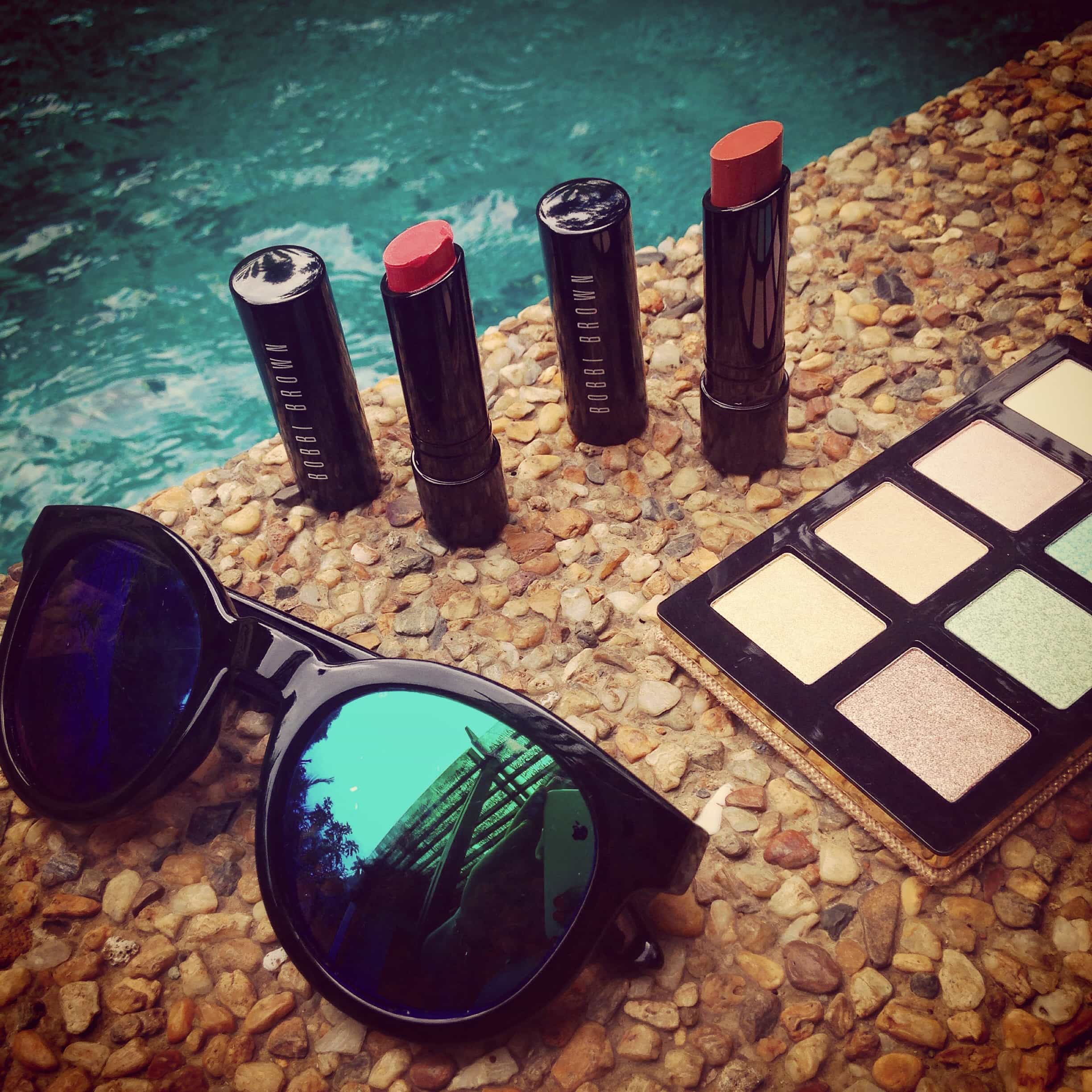 Above: Peach sorbet lipstick, Summer nude lipstick Surf and sand eye palette – all from Bobbi Brown, Sunglasses – Bonnie’s own