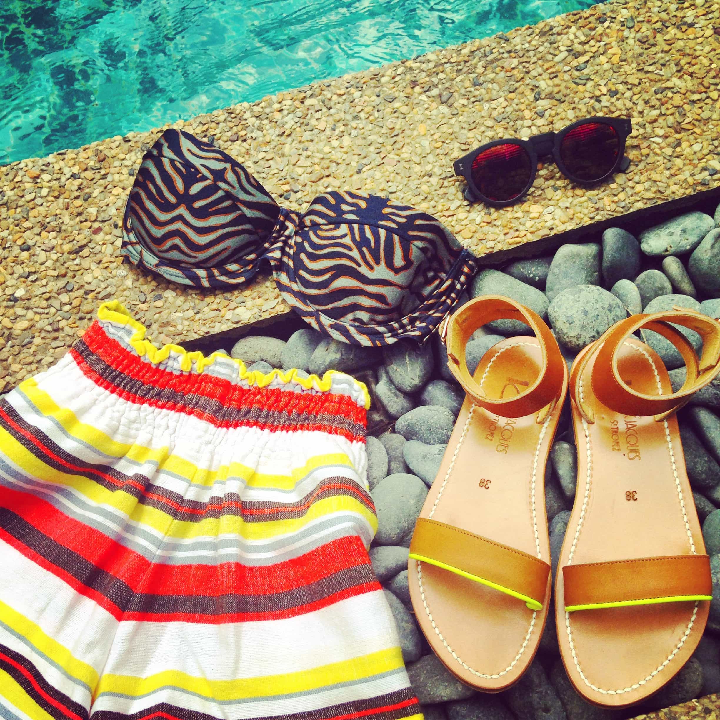Below: Bikini top – Zimmerman, Sunglasses – Illesteva, Tan sandals – K Jacques, Shorts – Lem Lem all Salt Resort Wear