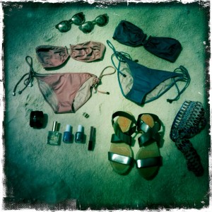 Clockwise from left: red 50’s bikini – ASOS www.asos.com, sunglasses – Persol www.persol.com, necklace and bracelet – Lucy Hutchings www.lucyhutchings.com, ring – Maria Francesca Pepe www.mfpepe.com, sandals – Office www.office.co.uk, terracotta skin foundation – Guerlain www.guerlain.com, lipstick – Revlon www.revlon.comLe Mosaique bronzing Powder – Clarins http://uk.clarins.com