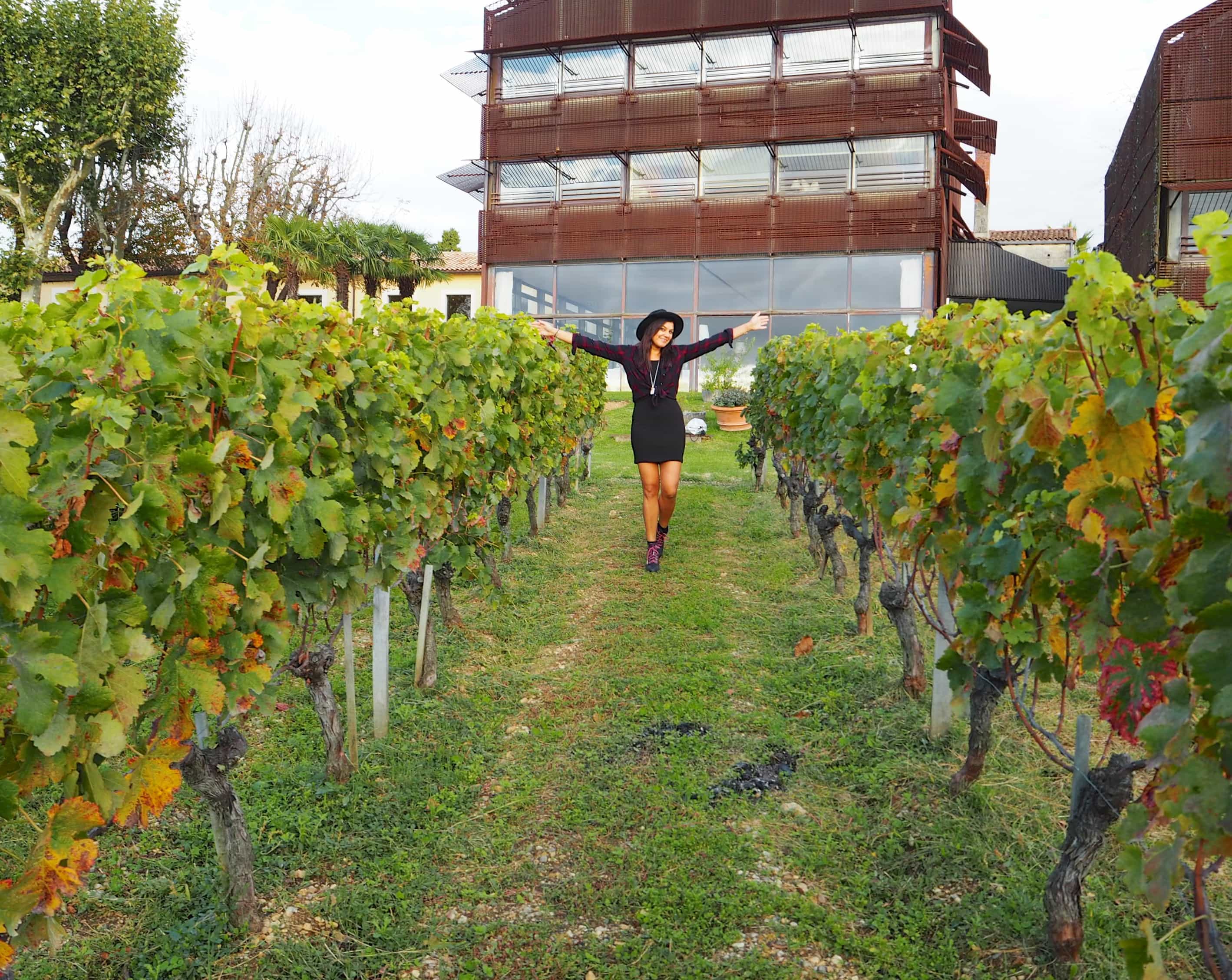 Me enjoying the vineyards at Le Saint James wearing Burgundy Boots by Sorel, Black dress by Helmet Lang, Check shirt and Hat by River Island, Necklace by Mint Velvet and Sunglasses by Le Specs.