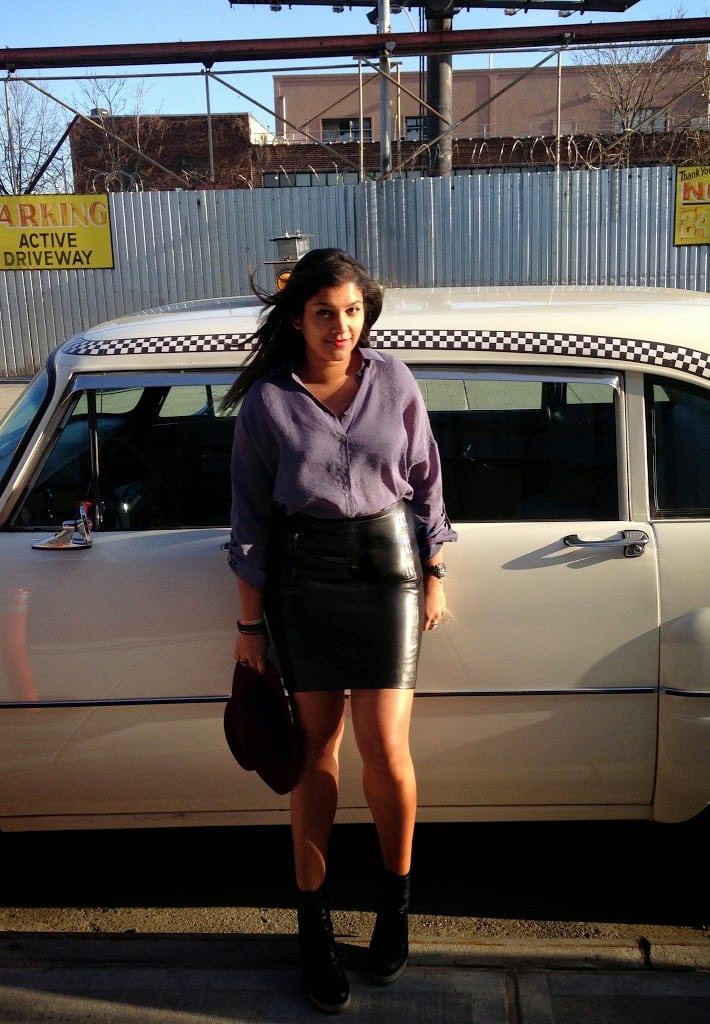 Outfit 2 – Blue oversized shirt, Black leather pencil skirt, both by Mint Velvet