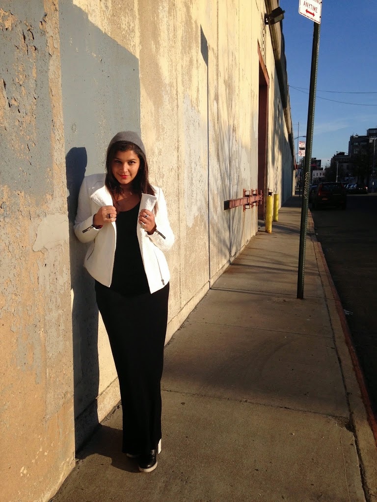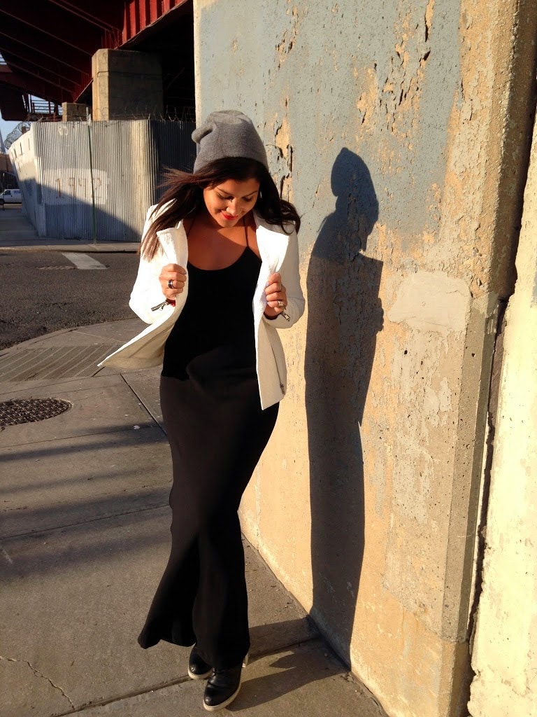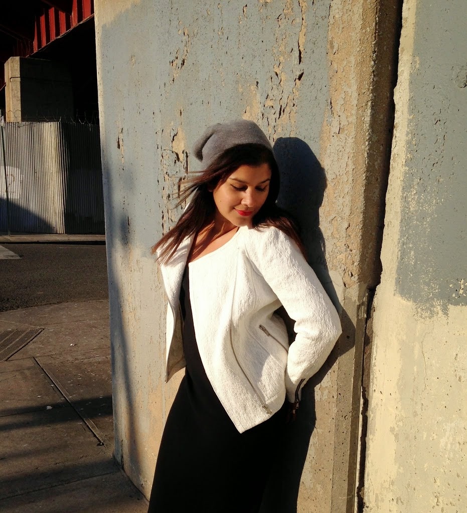 Outfit 3 – Black slip dress, Ivory jacquard biker jacket, both by Mint Velvet. Beanie hat Bonnie’s own.