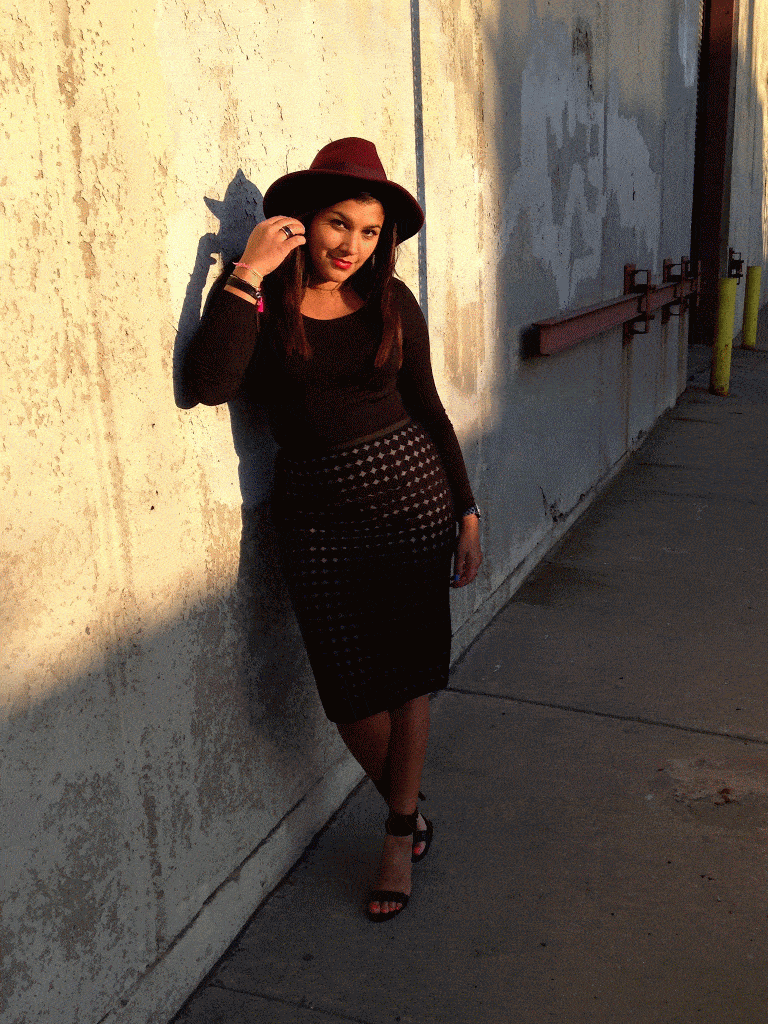 Outfit 4 – Black long sleeve modal tee, Black circles embroidered pencil skirt, both by Mint Velvet. Hat Bonnie’s own.