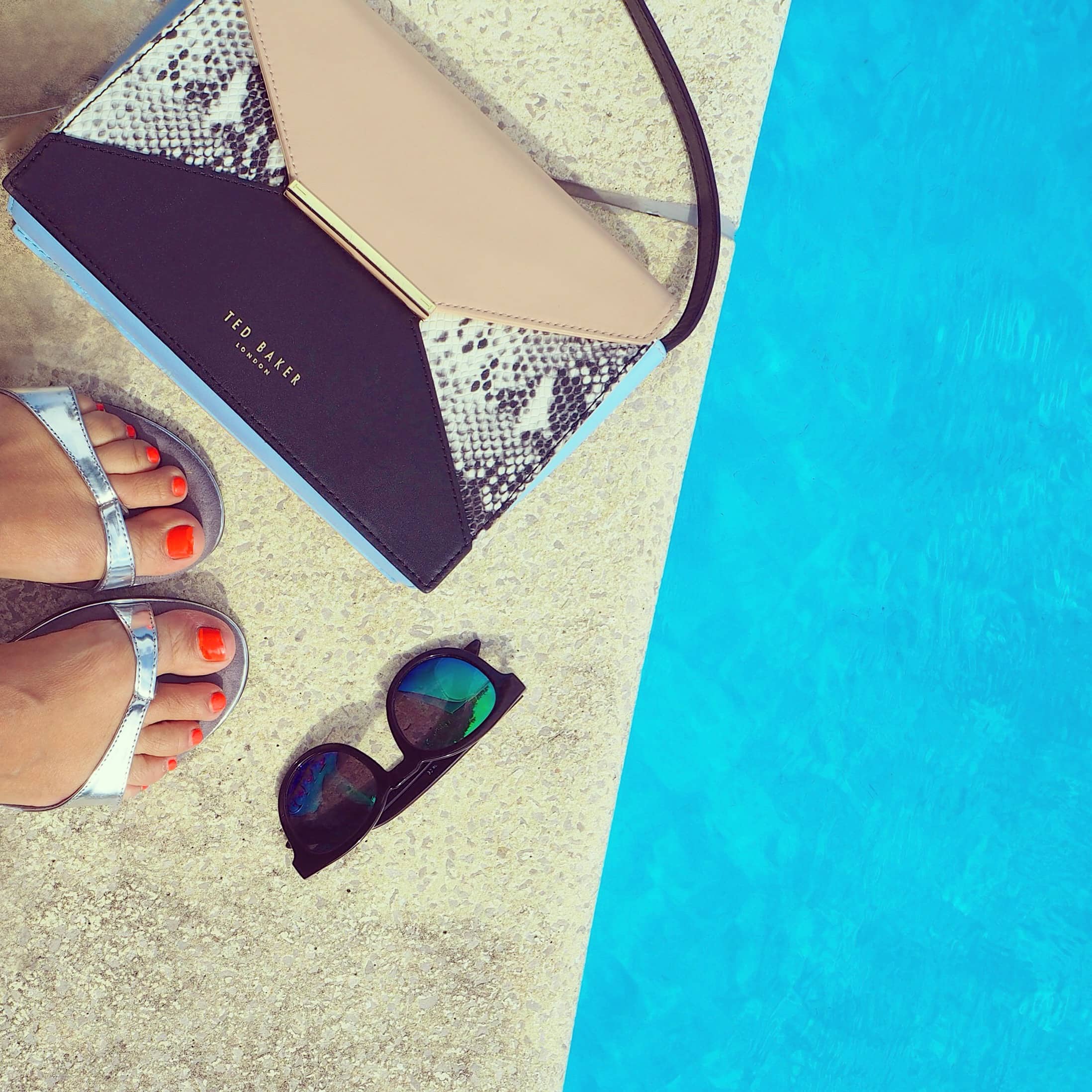 Camo loafers – Butterfly Twist, Blue bikini nail polish – Essie, Neon pink nail polish – American Apparel, Green sequin dress – Boohoo.com, Feather headdress – Bonnie’s own, Skull bikini – All Saints, Silver sandals – Butterfly Twist, Khaki jacket – Moncler, Sarong – By Malene Birger, Head dress – made at Wilderness festival by Bonnie, Factor 30 suncream – Rituals, Sequin skirt – Boohoo.com, Sunglasses – Karen Walker Eyewear, Circle frame sunglasses – Nikita, Tassel necklace – Accessorize, Samsung Galaxy S6 phone, Veuve Clicquot Rich Champagne, Foldable wellies – Butterfly Twist, Blue stripe throw – Hammamas, Suitcase – Globetrotter