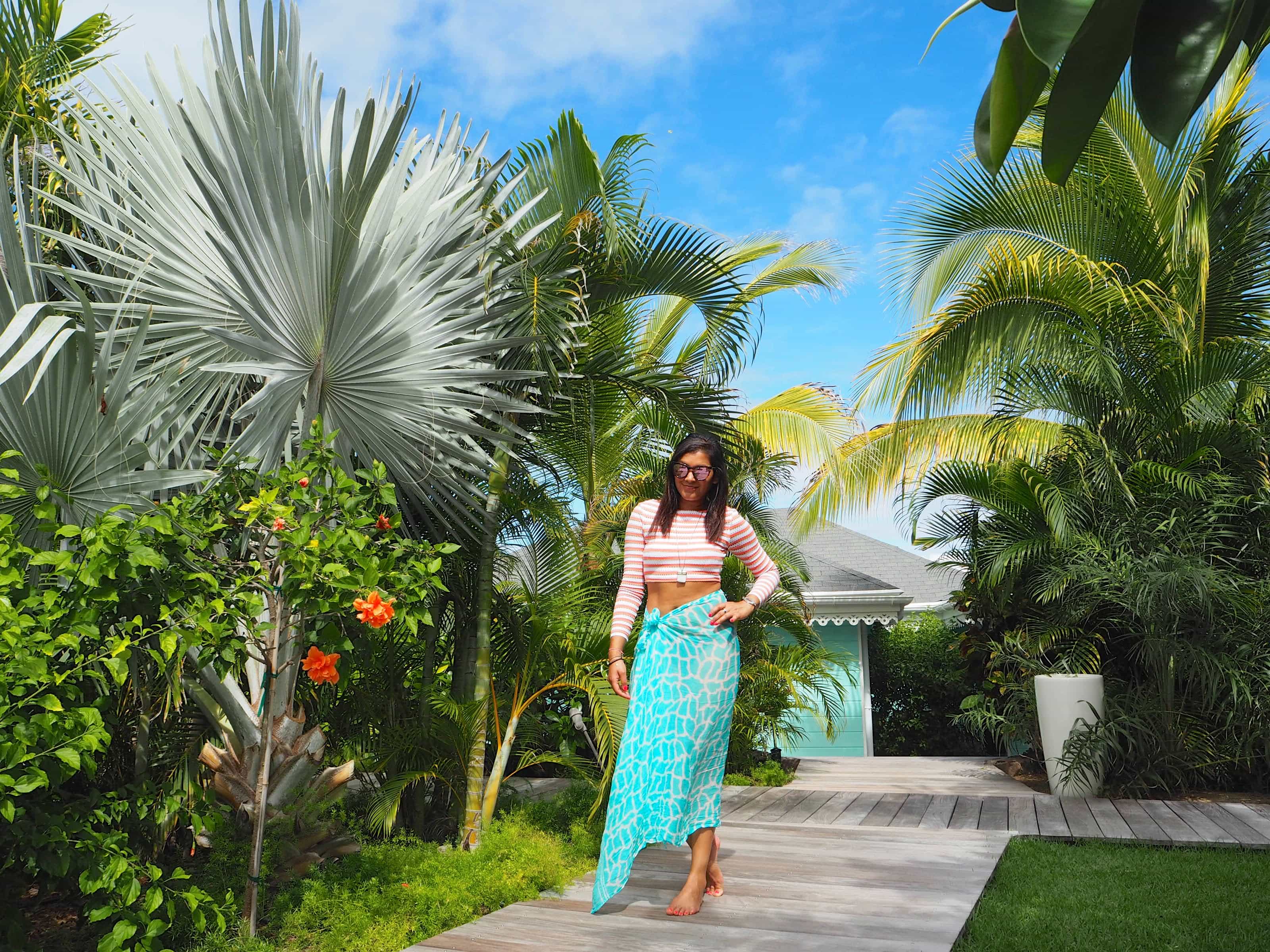 Above and below: The Style Traveller Bonnie posing at Le Guanahani wearing Stripe cropped rash top by Seafolly at Coco Bay, Sarong by Cloe Cassandro, Blue shorts by The Jetset Diaries, Necklace by Mint Velvet & Sunglasses by Le Specs.