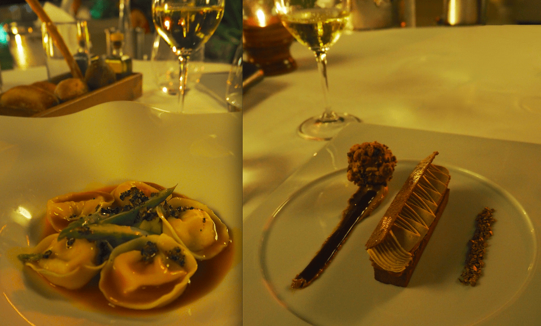 For the evening get dressed up and try the more formal dining experience at a la carte, Bartolomeo Restaurant. The atmosphere, like the food is more refined and elegant. Enjoy fine French cuisine in the serene, candlelit garden setting. Pictured below, my lobster ravioli starter and trio of chocolate dessert. Yum!