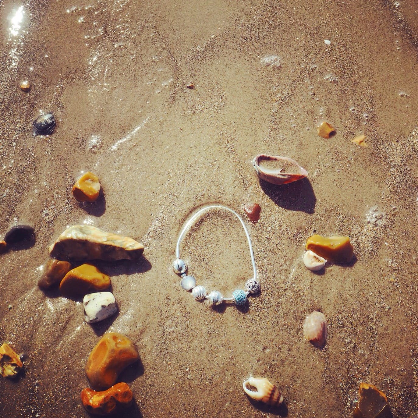Stunning setting on Chewton Beach. Bottom left – Barney the dog goes for a morning walk and bottom right – the Pandora Essence bracelet with a few tasks completed.